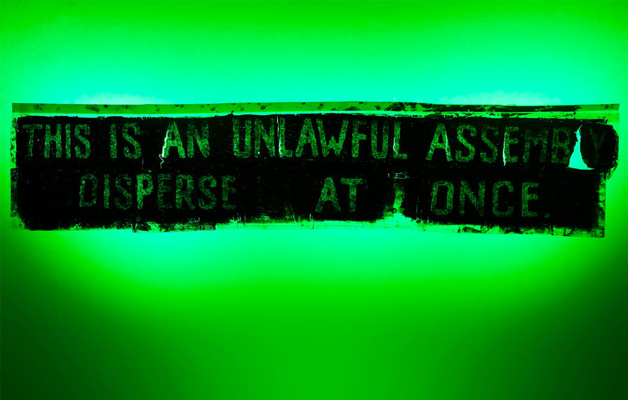 In 2009 Jason Kunke began a series of handmade mimeograph prints, each recreating part of a photograph from Riot Control: Material and Techniques (Rex Applegate, 1981). The original image was of two officers holding a sign—the sign read, "THIS IS AN UNLAWFUL ASSEMBLY DISPERSE AT ONCE"—demonstrating a legal dispersal order. The police must give dispersal orders to a crowd before the police are allowed to use force. Dispersal orders represent a bifurcation point, the deciding moment before the clash of authority and resistance. The mimeograph prints Kunke made were life-size, 80” by 27”, presented as artifacts on a variety of substrates, inserting some authority into an art framework, and hopefully problematizing the political efficacy of art.