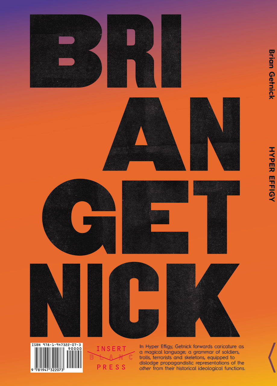 In Hyper Effigy, Brian Getnick forwards caricature as a magical language; a grammar of soldiers, trolls, terrorists and skeletons, equipped to dislodge propagandistic representations of the other from their historical ideological functions. This full-color exhibition catalog accompanied the 2021 exhibition of the same name at General Projects and Outside Gallery, and includes an introduction by the publisher and an essay by Grace Hadland.