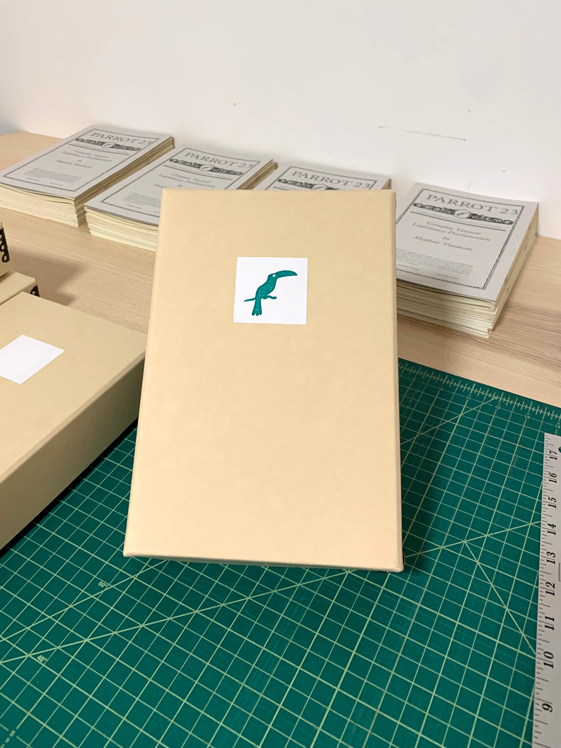 A complete set of the PARROT series published by Insert Press, 2010-2014, wrapped in archival tissue and boxed in an archival box. Issues 1-4 and 6-8 are signed and numbered by the authors.