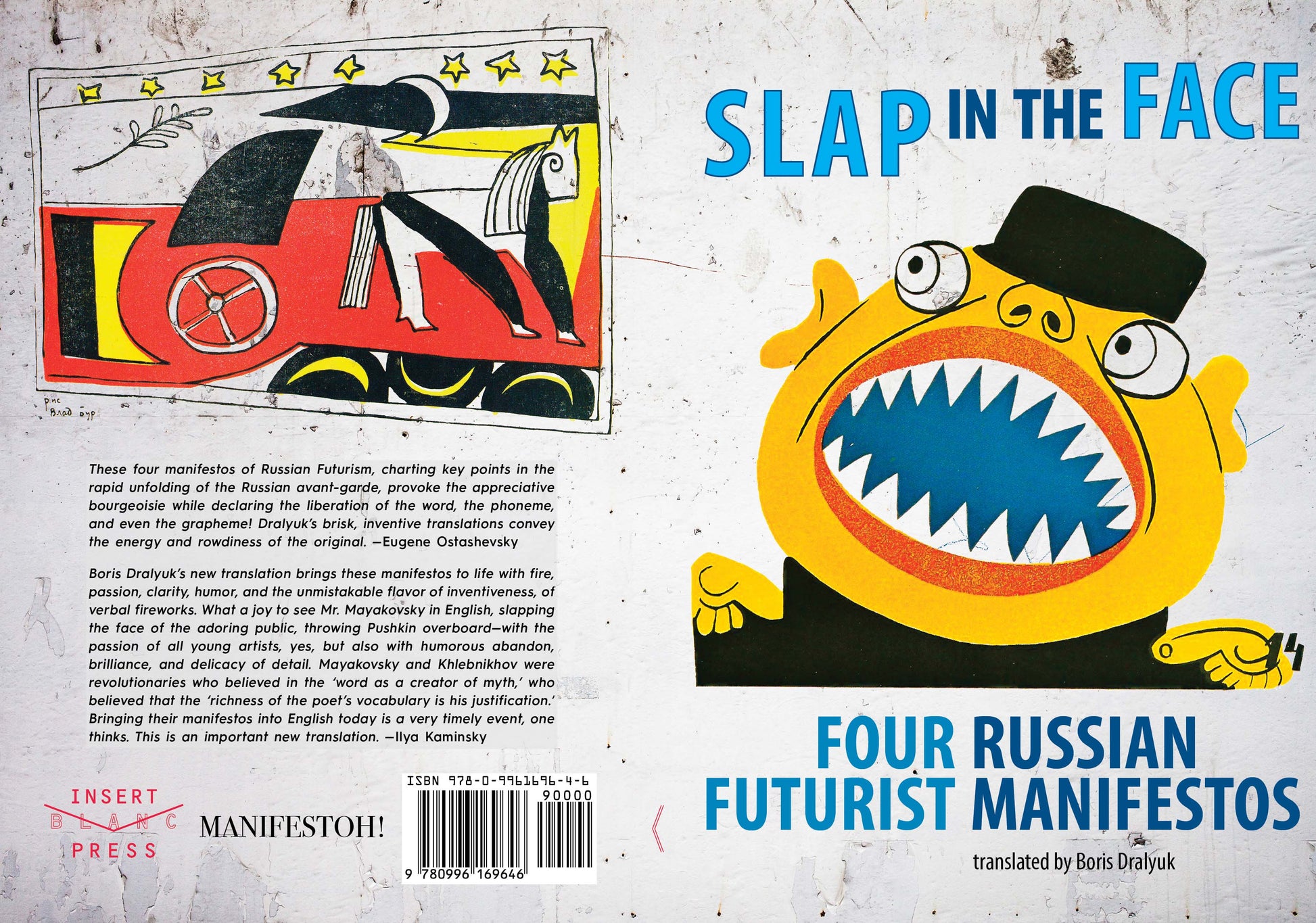 Four Russian Futurist Manifestos contains "A Slap in the Face of Public Taste" (1912), the manifesto from A Trap for Judges II (1913), "Go to Hell!" (1914), and "A Drop of Tar" (1915). The collection is the first installment of Insert Press's Manifestoh! series curated by editor Shook.