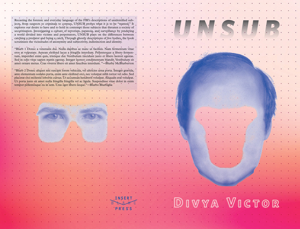 Recasting the forensic and everyday language of the FBI’s descriptions of unidentified subjects, from suspects to criminals to corpses, UNSUB probes what it is to be “wanted.” It explores our desire to have and to hold in contempt those subjects that threaten a society of securitization. Investigating a culture of terrorism, paranoia, and surveillance by rendering a world divided into victims and perpetrators, UNSUB plays on the differences between catching a predator and being a catch. Through ghostly descriptions of live bodies, the book scrutinizes the vicissitudes of anonymity and subjectivity, indistinction and identity.